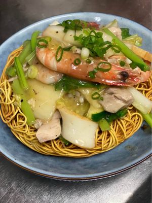 This dish features golden, crispy egg noodles topped with a flavorful stir-fry of your choice of meat and fresh vegetables. The combination is coated in a rich, savory sauce made with shiitake mushrooms and thickened with corn starch, creating a glossy, satisfying texture. With a perfect balance of crunch and tenderness, this dish is a comforting and delicious meal for any occasion.