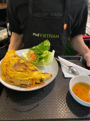 Bánh Xèo is a crispy, golden Vietnamese pancake made from rice flour, coconut milk, and turmeric, giving it a signature yellow hue. The batter is pan-fried until lacy and crisp, then filled with a delicious mix of stir-fried seafood, chicken, or both, combined with fresh vegetables like bean sprouts, onions, and carrots. Served with fragrant herbs, lettuce, and a side of tangy fish sauce dip, Bánh Xèo offers a perfect balance of crunch, flavor, and freshness in every bite.