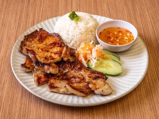 A hearty and flavorful dish featuring fragrant steamed rice served with your choice of grilled pork chop, grilled chicken, stir-fried beef, or stir-fried seafood.. All meats are expertly marinated for deep, savory flavors, then cooked to perfection. Served with pickled carrots for a refreshing crunch, fresh vegetables, and a side of signature dipping sauce, this dish offers a satisfying and well-balanced meal.